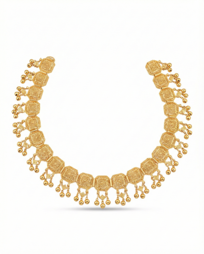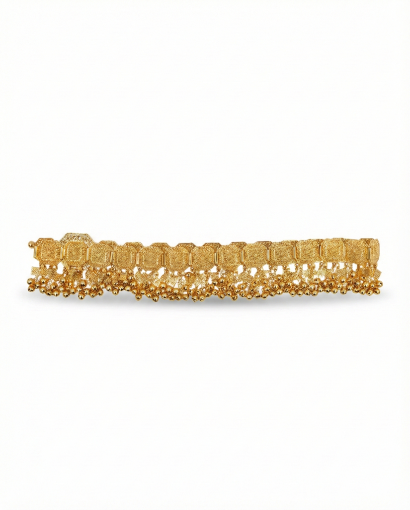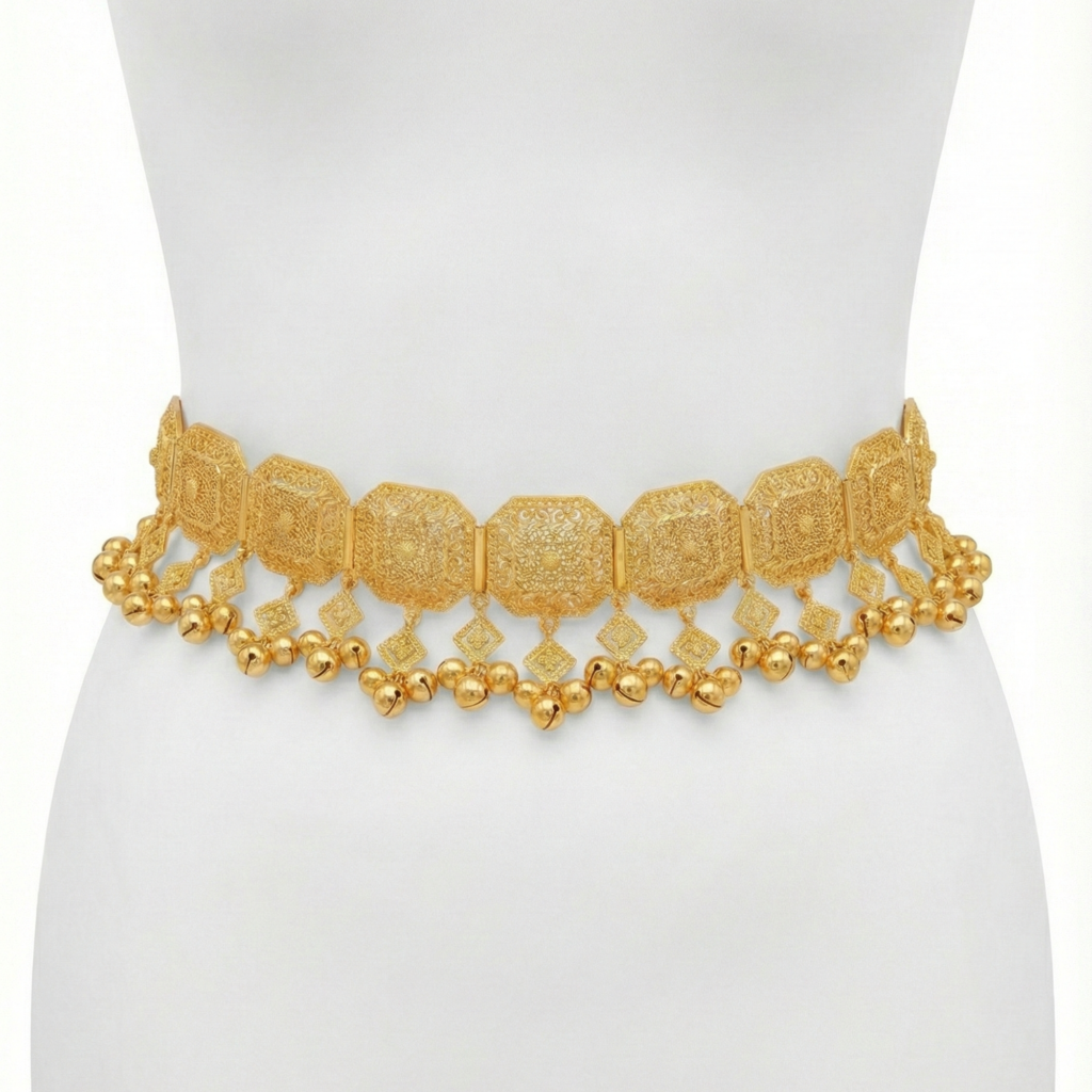حزام بتصميم تقليدي من قطع منقوشة مترابطة مع تعليقات كروية متدلية تعطي حركة خفيفة. مطلي بالذهب بلون ذهبي لامع ومقاس قابل للتعديل.