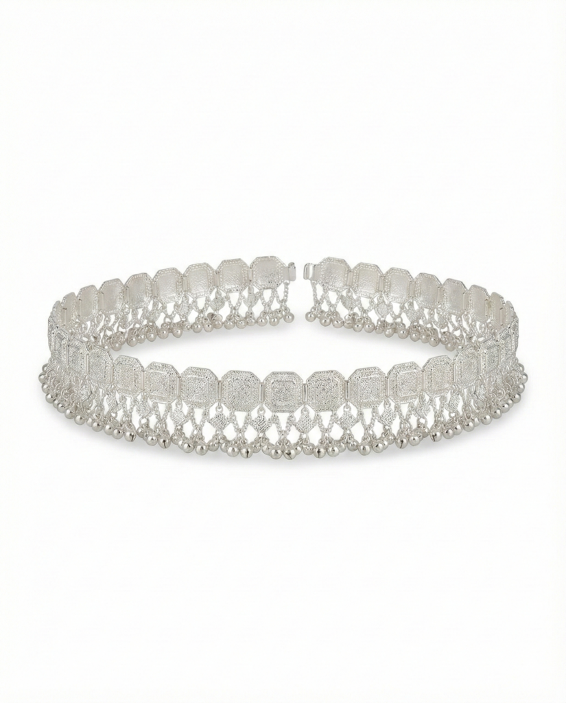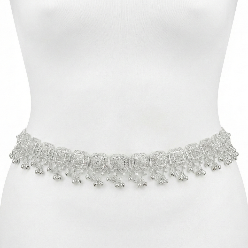 حزام بتصميم تقليدي من قطع مترابطة بنقوش هندسية مع تعليقات كروية متدلية تعطي حركة خفيفة عند الارتداء. اللون فضي لامع والمقاس قابل للتعديل ليناسب مختلف الأحجام