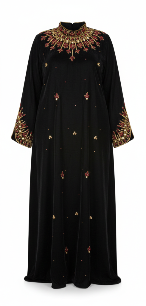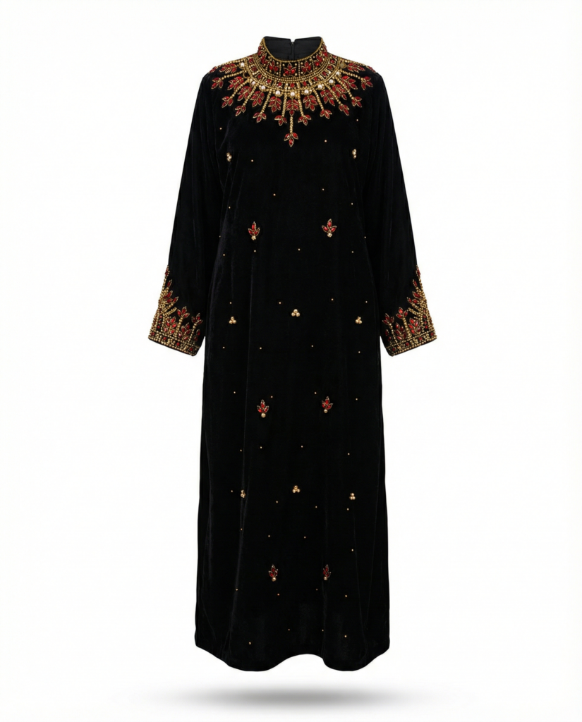 قطعة 4 وار من قماش المخمل بتصميم ناعم وانسيابي، مزينة بتطريز أنيق على الأكمام ومنطقة الرقبة يبرز التفاصيل بشكل راقٍ. الخامة مريحة وتبرز مظهرًا فخمًا مناسبًا للمناسبات والإطلالات الخاصة