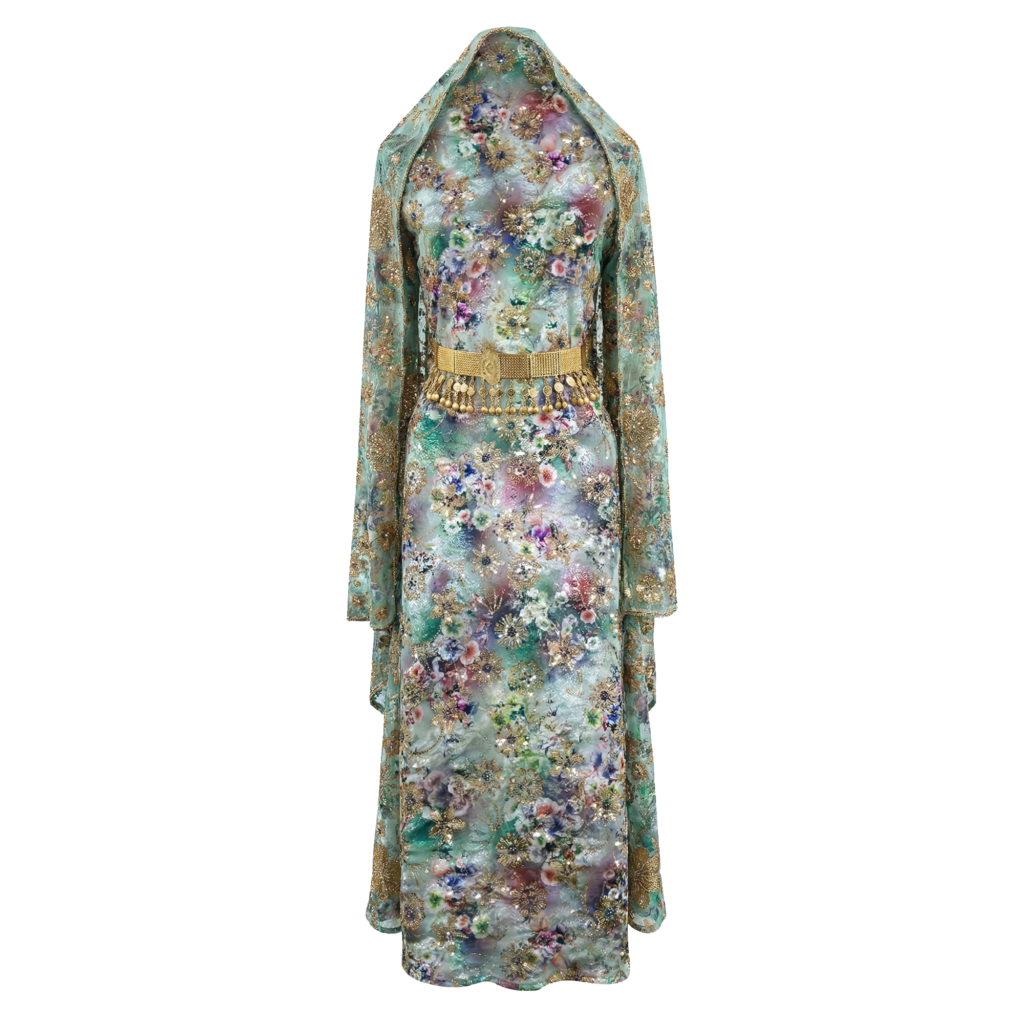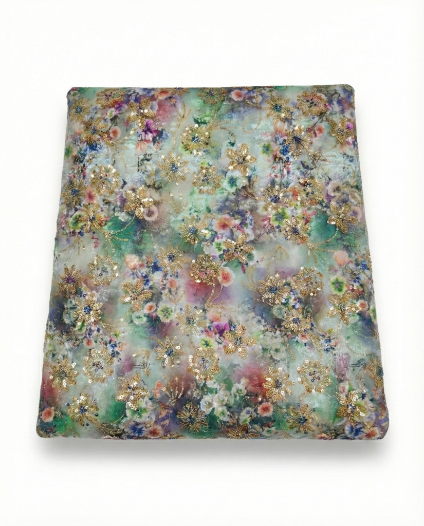 قماش فاخر مطرز بزهور متعددة الألوان على خلفية خضراء هادئة ، 4 وار، خيار مميز لتفصيل قطع سهرة راقية.