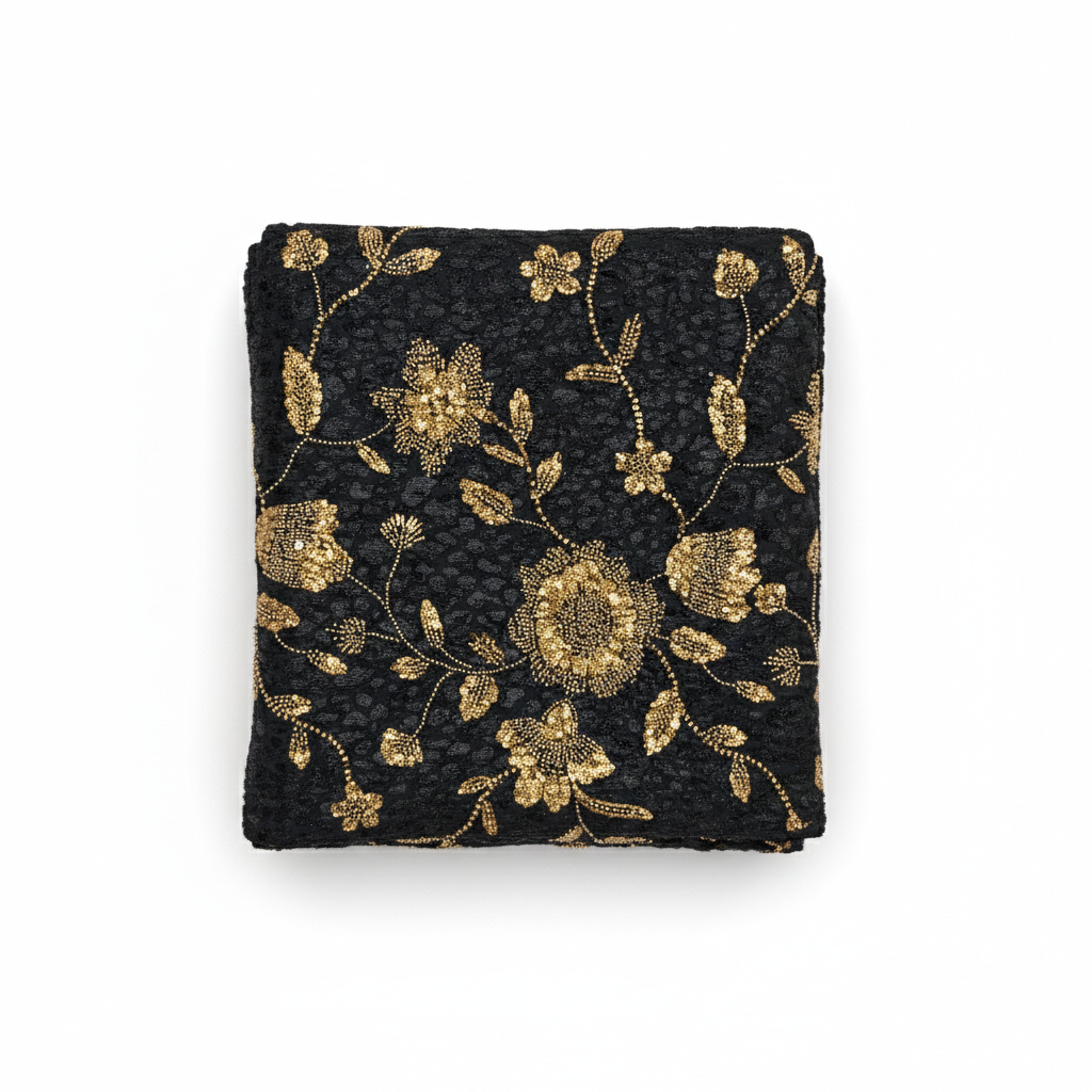 قماش أسود مطرز بنقوش وردية ذهبية لامعة، 4 وار، مثالي لتفصيل تصاميم سهرة فاخرة بلمسة ملكية.
