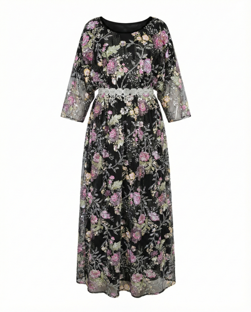 قماش دانتيل أسود مزين بزهور وردية ناعمة مع حزام أنيق، 4 وار، مناسب لتفصيل إطلالات أنثوية رومانسية للمناسبات.